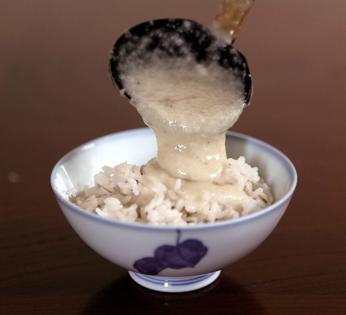 ②自然解凍したとろろ汁を米粒がおよぐ位たっぷりかける。